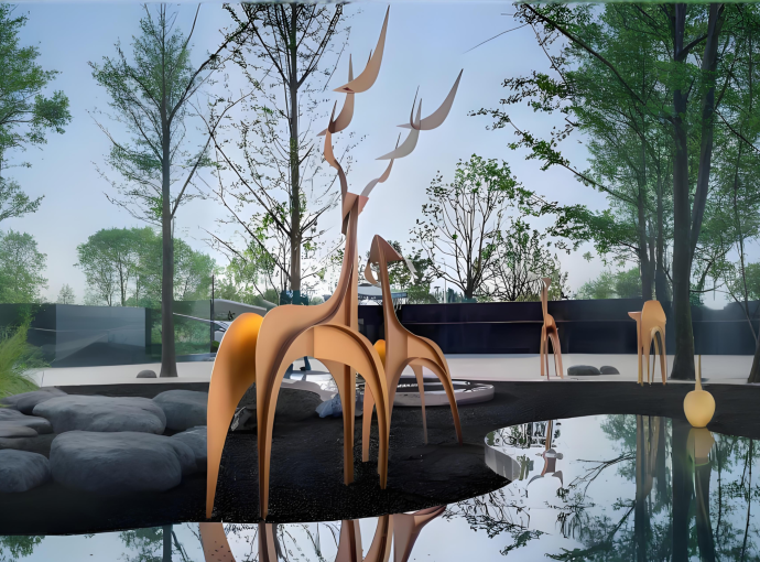 抽象化的鹿形,是对传统意象的当代转译。艺术家摒弃了纤毫毕现的写实,转而捕捉鹿最精炼的神韵:或许是一道优雅昂首的弧线,勾勒出警觉与灵性;或许是几何形体的大胆构叠,传达力量与稳定。这种“抽象”,并非疏离,而是邀请观者以自身的经验与想象参与完成作品的最终意义。它如同一个视觉谜题,激发互动与解读,让冰冷的金属焕发出思想的温度。加之不锈钢材质特有的镜面反射或拉丝质感,雕塑本身更成为一个动态的媒介,将天空流云、周遭建筑、往来人群纳入自身,时刻生成着瞬息万变的画面,使静态的雕塑拥有了流动的生命。