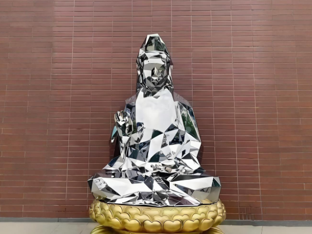 冷与柔的辩证,为这类雕塑注入了独一无二的艺术张力。不锈钢以坚硬著称,但艺术家却凭借精湛的技艺,在利落的几何切面中勾勒出菩萨低眉垂首的柔和轮廓,实现了“刚柔并济”的境界。更令人赞叹的是镜面抛光工艺——雕塑表面经多道精细打磨后反射率可达85%以上。每一个切面都成为捕捉与折射光的精巧容器:晨光熹微时,雕塑映出柔和的银灰;正午烈日下,化作耀目的碎金;日暮时分,便笼罩在温暖的金红色光辉之中。观者在凝视雕塑的同时,亦能看见自身的倒影流转于其间,仿佛与菩萨共同融入了无尽的时空幻象。